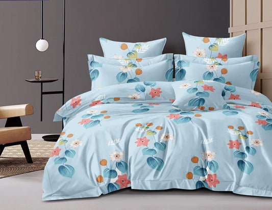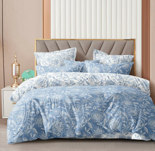 BOGO Fabicra Blue Blossom Cotton Elastic Fitted King Size Double Bed Bedsheet with 2 Pillow Covers
