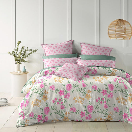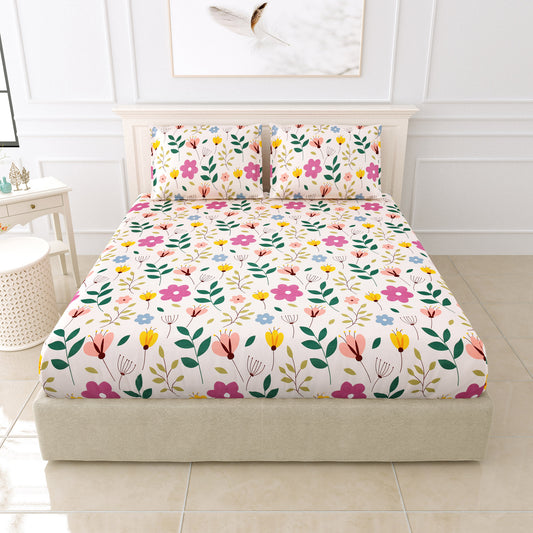 BOGO Premium Floral Bloom Design Cotton Elastic Fitted King Size Double Bed Bedsheet with 2 Pillow Covers