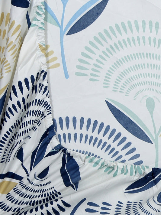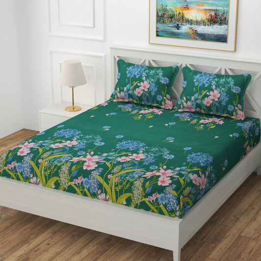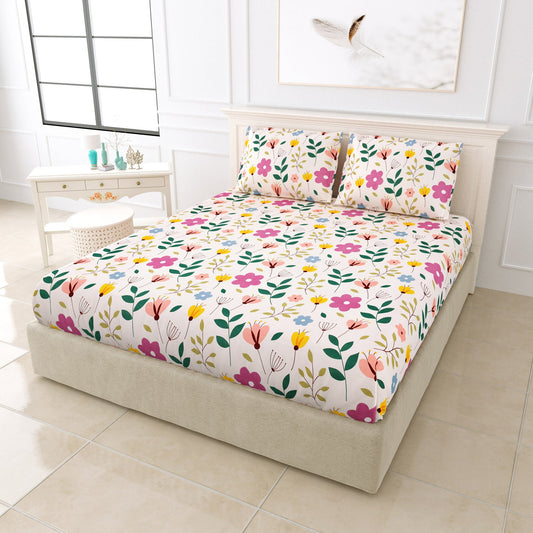 BOGO Premium Floral Bloom Design Cotton Elastic Fitted King Size Double Bed Bedsheet with 2 Pillow Covers