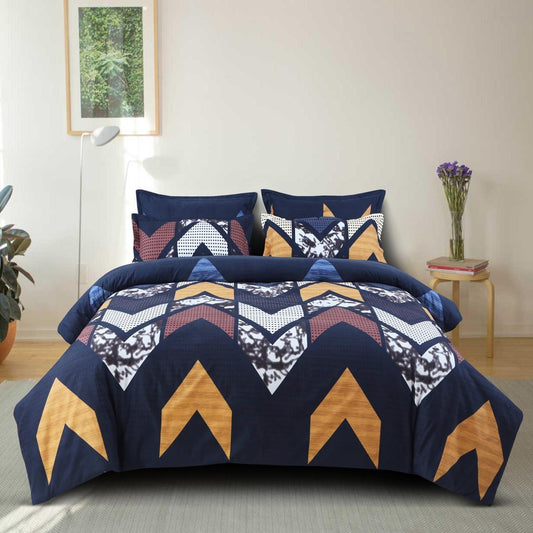 BOGO Fabicra Navy Blue Geometric Cotton Blend Elastic Fitted King Bedsheet with 2 Pillow Covers