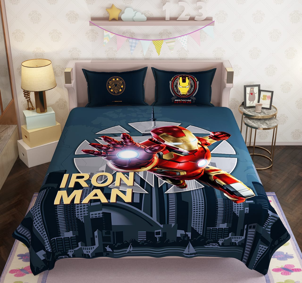 100% Cotton Kids Iron Man Double Bed Bedsheet with Pillow Covers - 250 Thread Counts