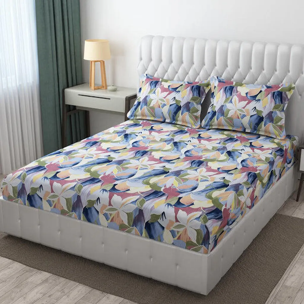 BOGO Premium Floral Bloom Design Cotton Elastic Fitted King Size Double Bed Bedsheet with 2 Pillow Covers