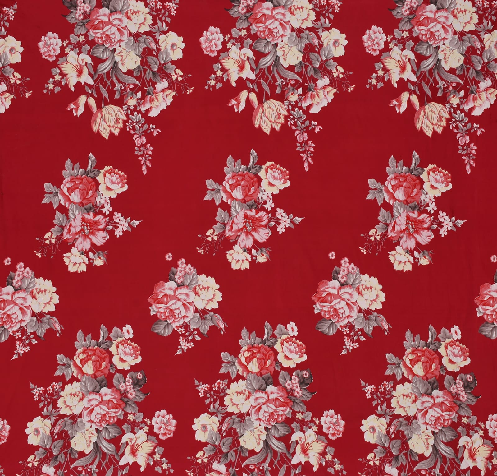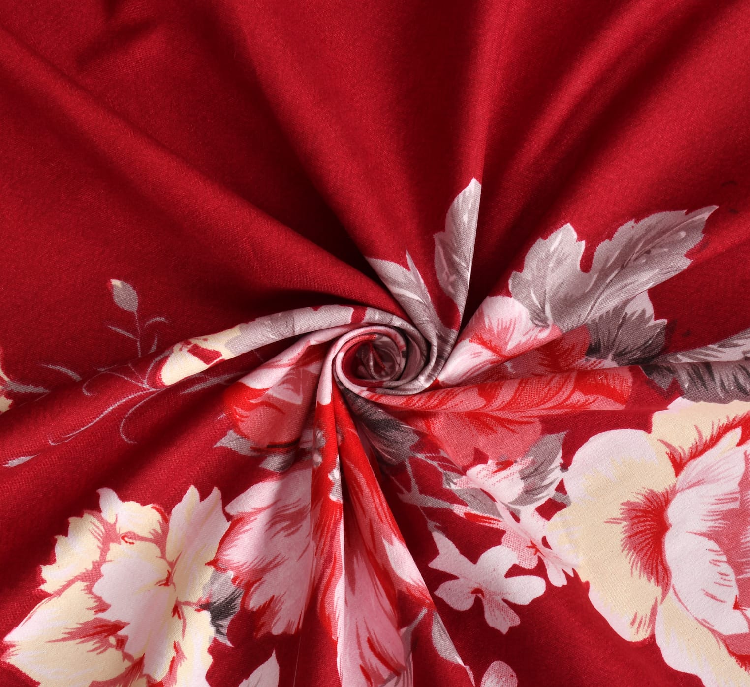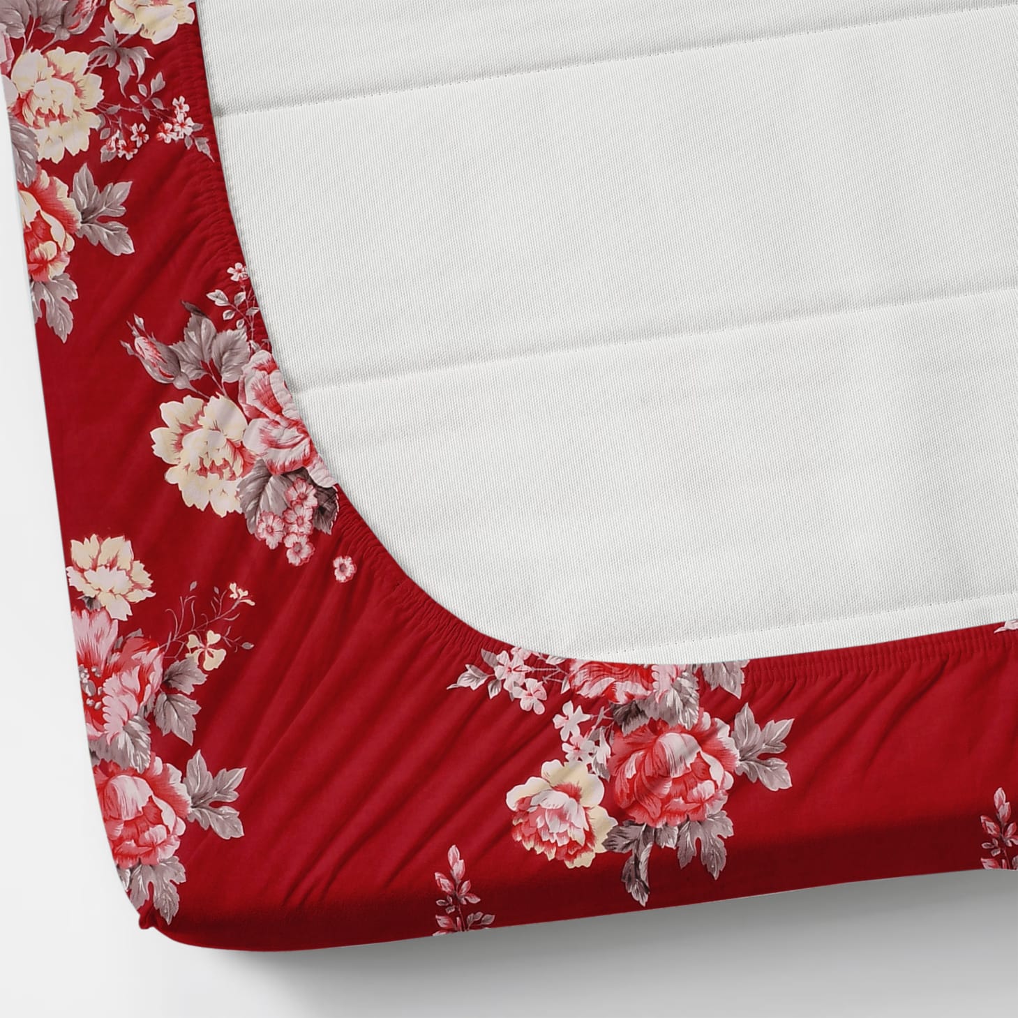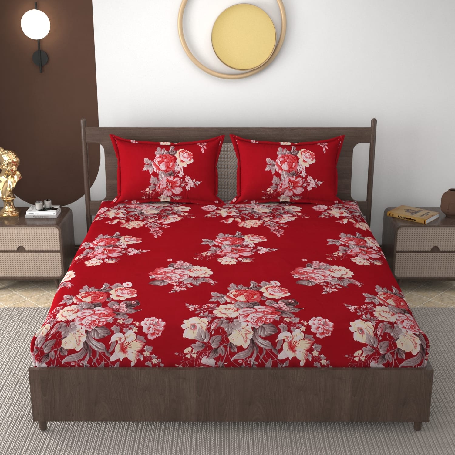 Fabicra Red Floral Cotton Blend Elastic Fitted King Bedsheet with 2 Pillow Covers